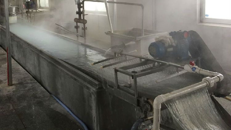自動上料→打芡→和面→抽真空→旋葉震動下瓢→鏈條傳動蒸煮→傳送冷卻→切條撥粉→常溫老化→冷凍散粉→干燥包裝
